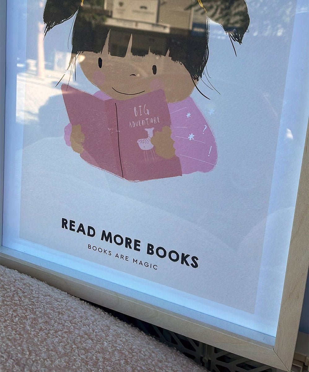 Póster con un niño, vestido con un suéter azul, leyendo un libro de aventuras rojo y con la frase “ Leer más libros, los libros son mágicos ”. Una divertida ilustración que encaja perfectamente en la decoración de las habitaciones infantiles. Este cartel pertenece a la colección "Los niños lo hacen mejor ", cuya inspiración es vivir una vida feliz y significativa. Es una ilustración original de CatitaIllustrations ®. El póster está disponible en 2 colores y en varios tamaños.