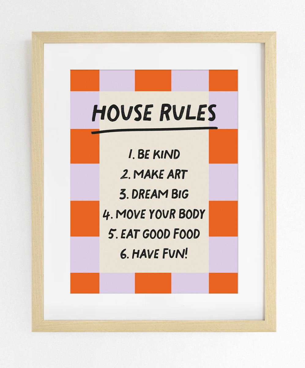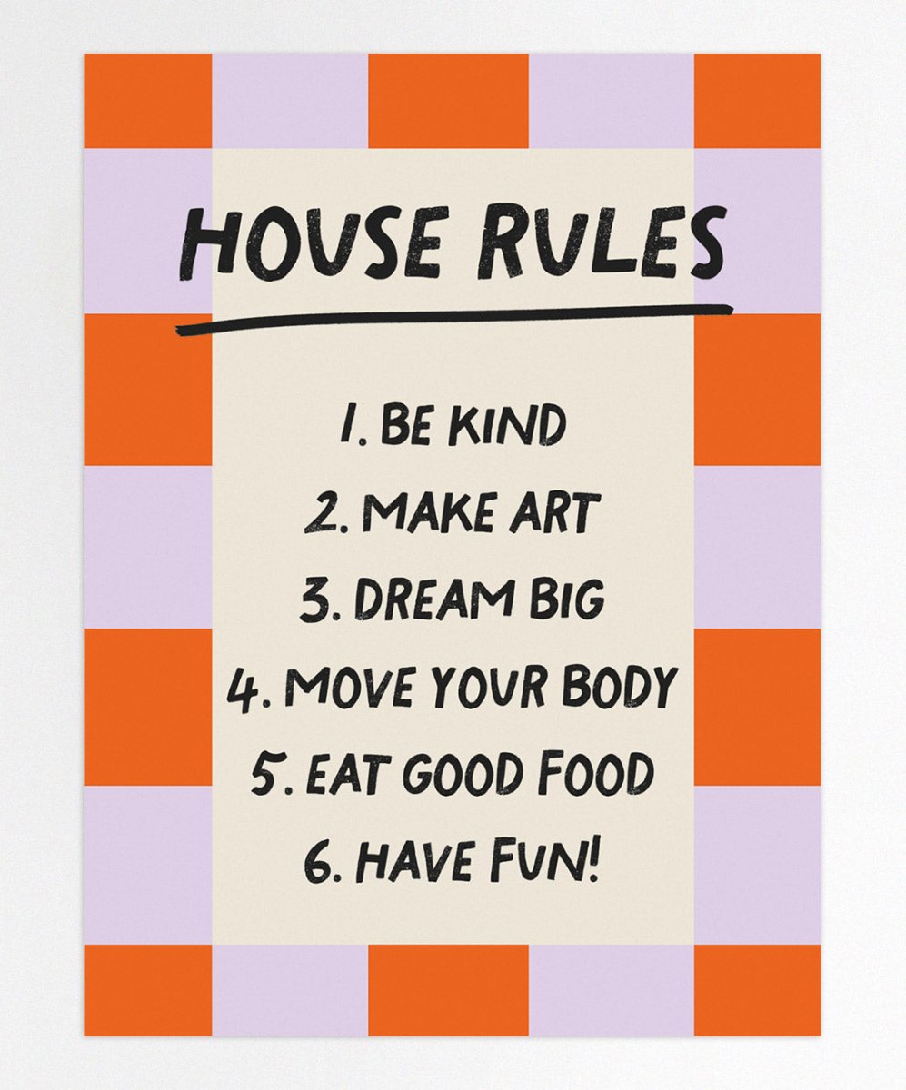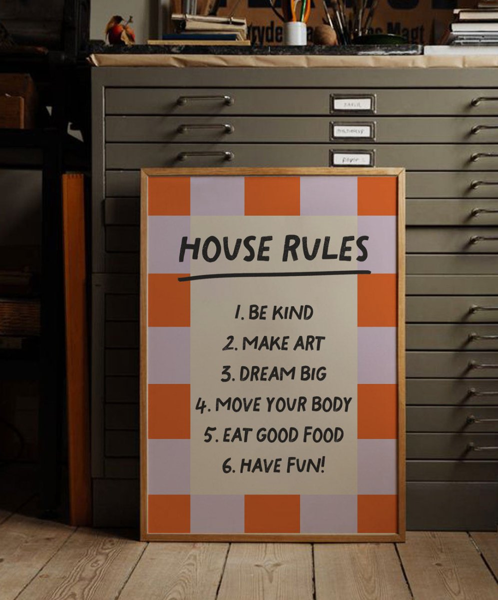 Get inspired every day with the 'House Rules' poster by Catita Illustrations! Inspirational and colorful, it features simple rules for a light and joyful life. Available in various sizes, both physical and digital, it's perfect for spreading good vibes!