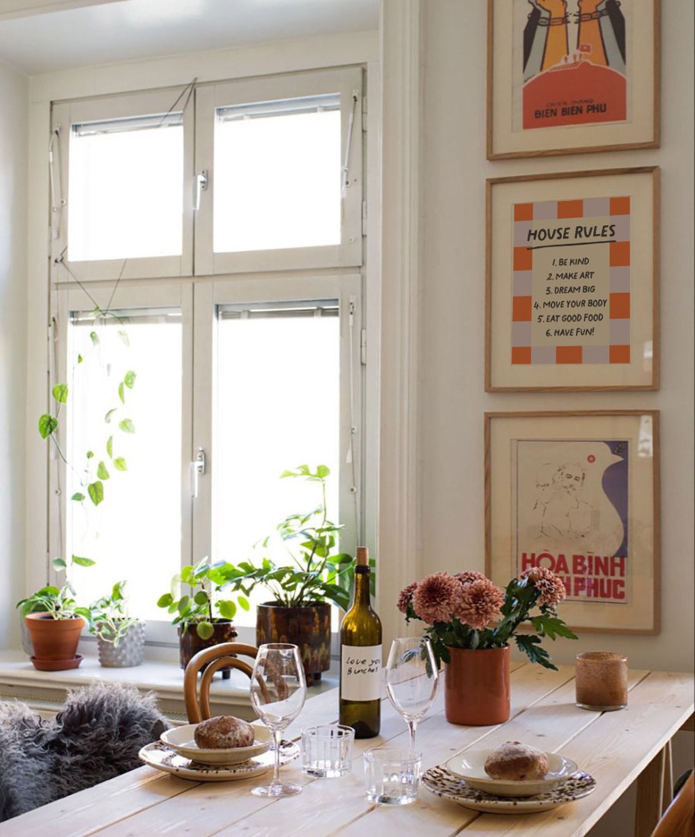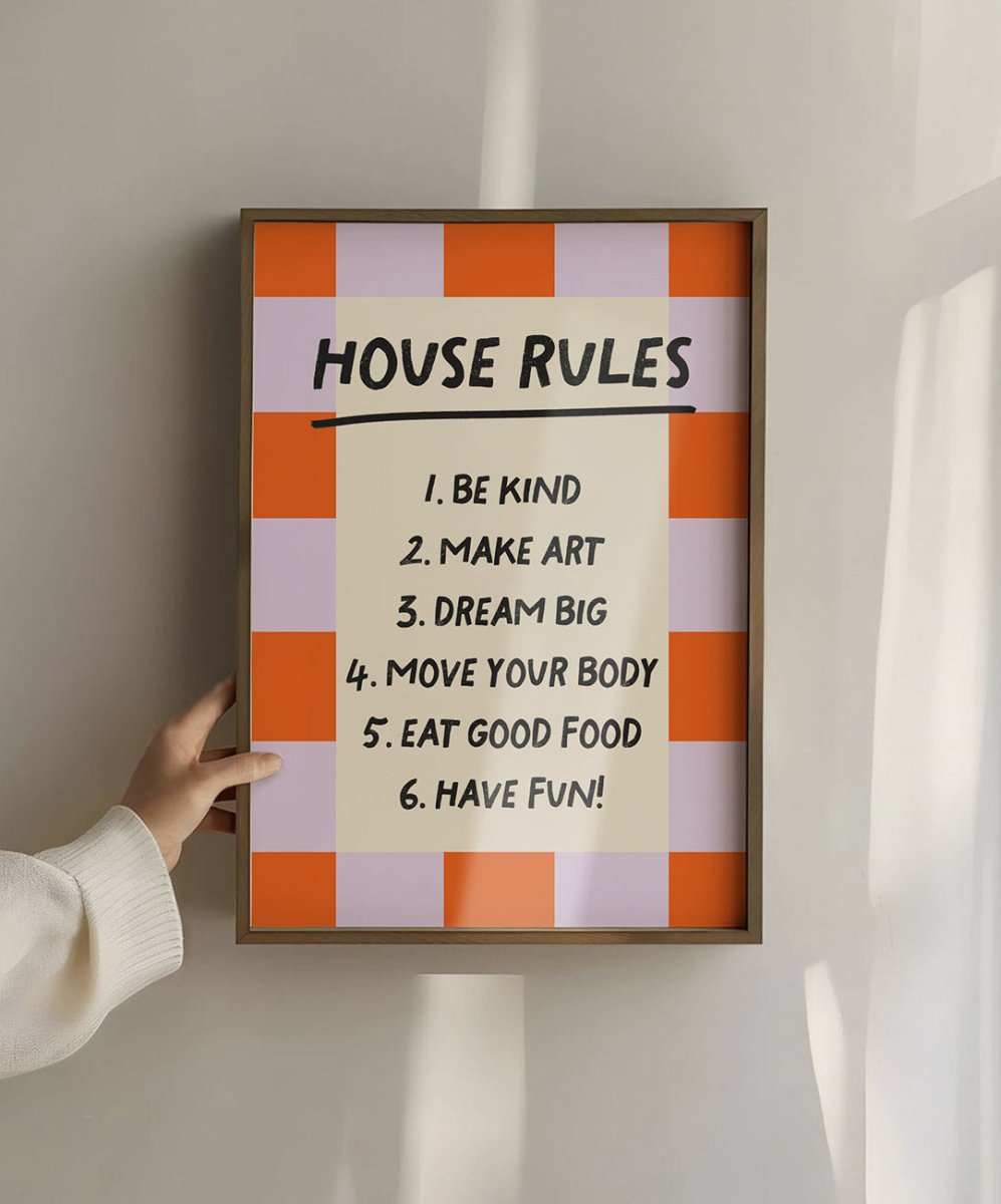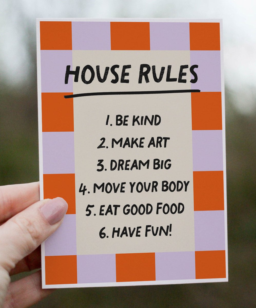 Get inspired every day with the 'House Rules' poster by Catita Illustrations! Inspirational and colorful, it features simple rules for a light and joyful life. Available in various sizes, both physical and digital, it's perfect for spreading good vibes!