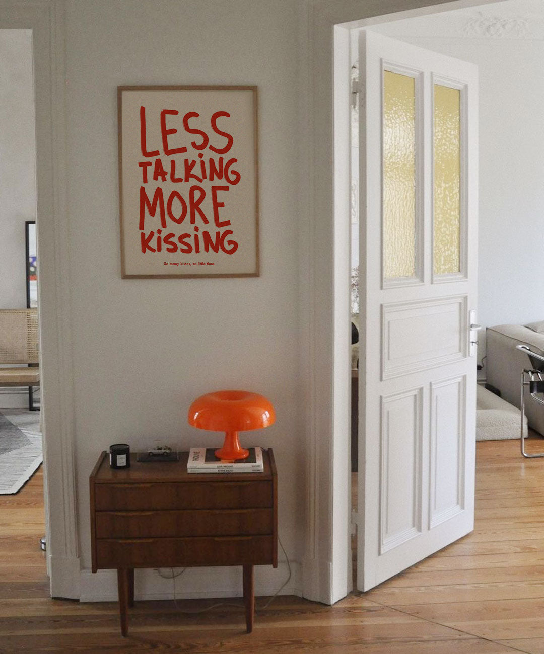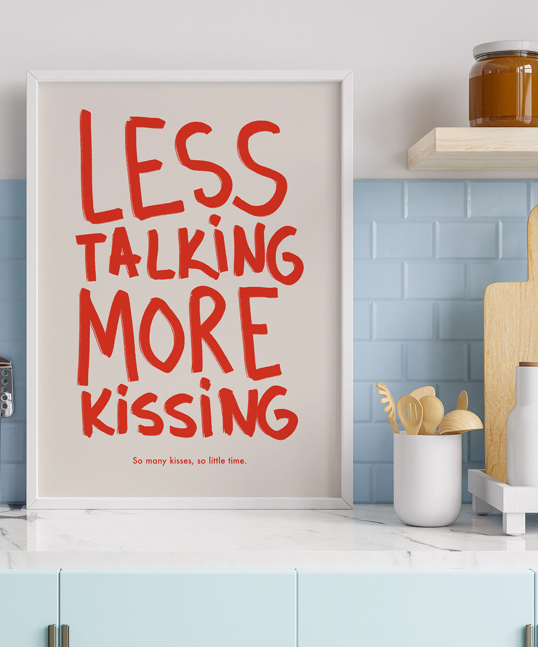 Fall in love with the 'Less Talking, More Kissing' poster from Catita Illustrations. Poster with red painted letters 'Less Talking, More Kissing' and smaller letters below 'So many kisses, so little time.' available in physical or digital version and in 3 sizes. Perfect to surprise on Valentine's Day with a dose of humor!