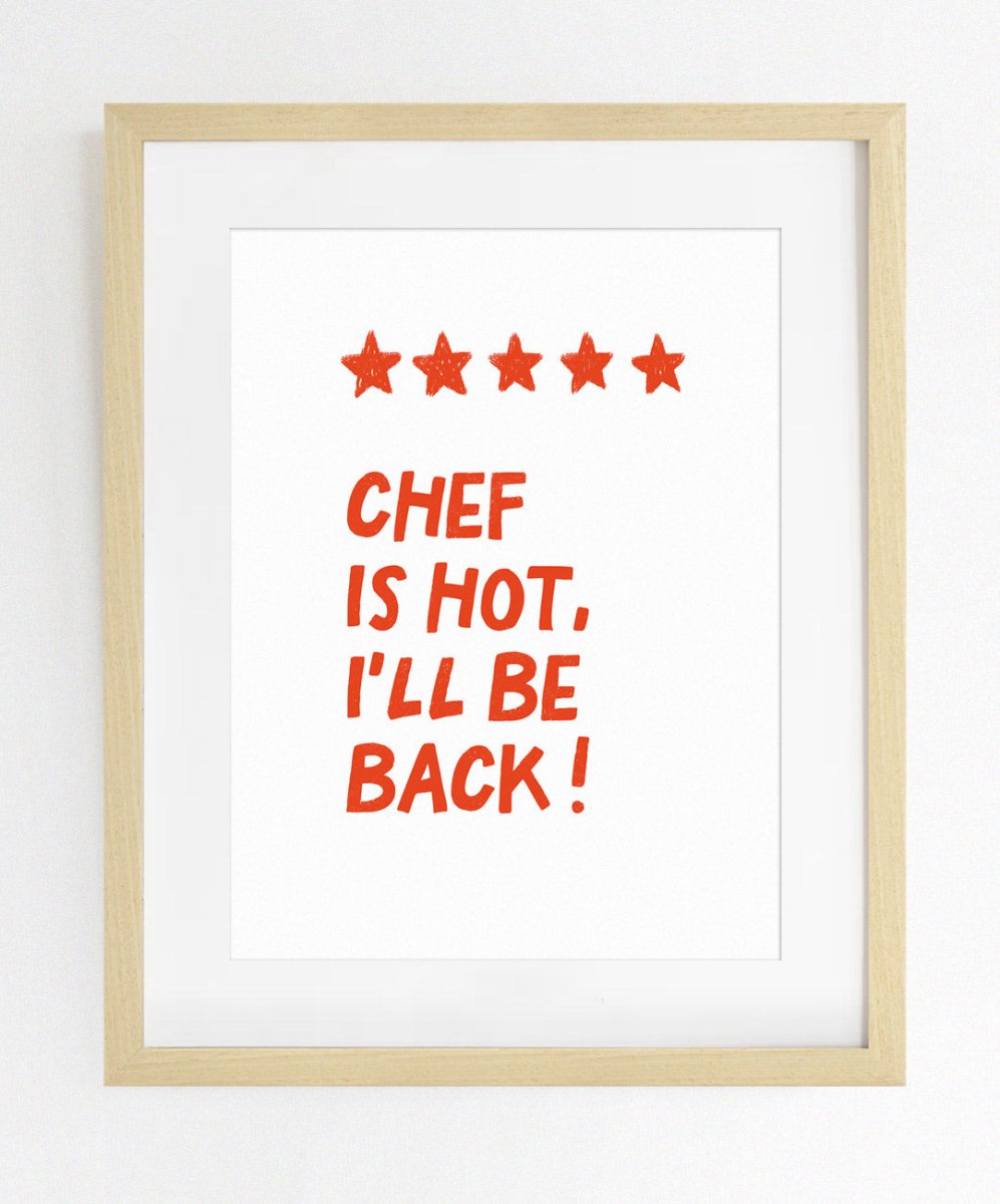 Add a touch of humor to your kitchen with the "Chef is Hot, I’ll be back!'" Poster. With 5 stars and the promise "Chef is HOT, I’ll be back!", it's the perfect detail to commemorate unique moments with friends and loves. Available in various sizes, in both physical and digital versions.