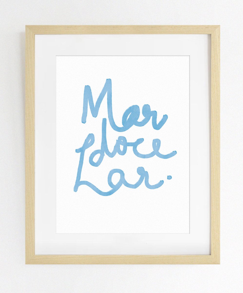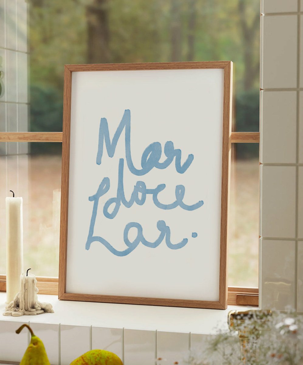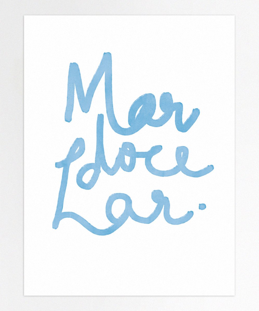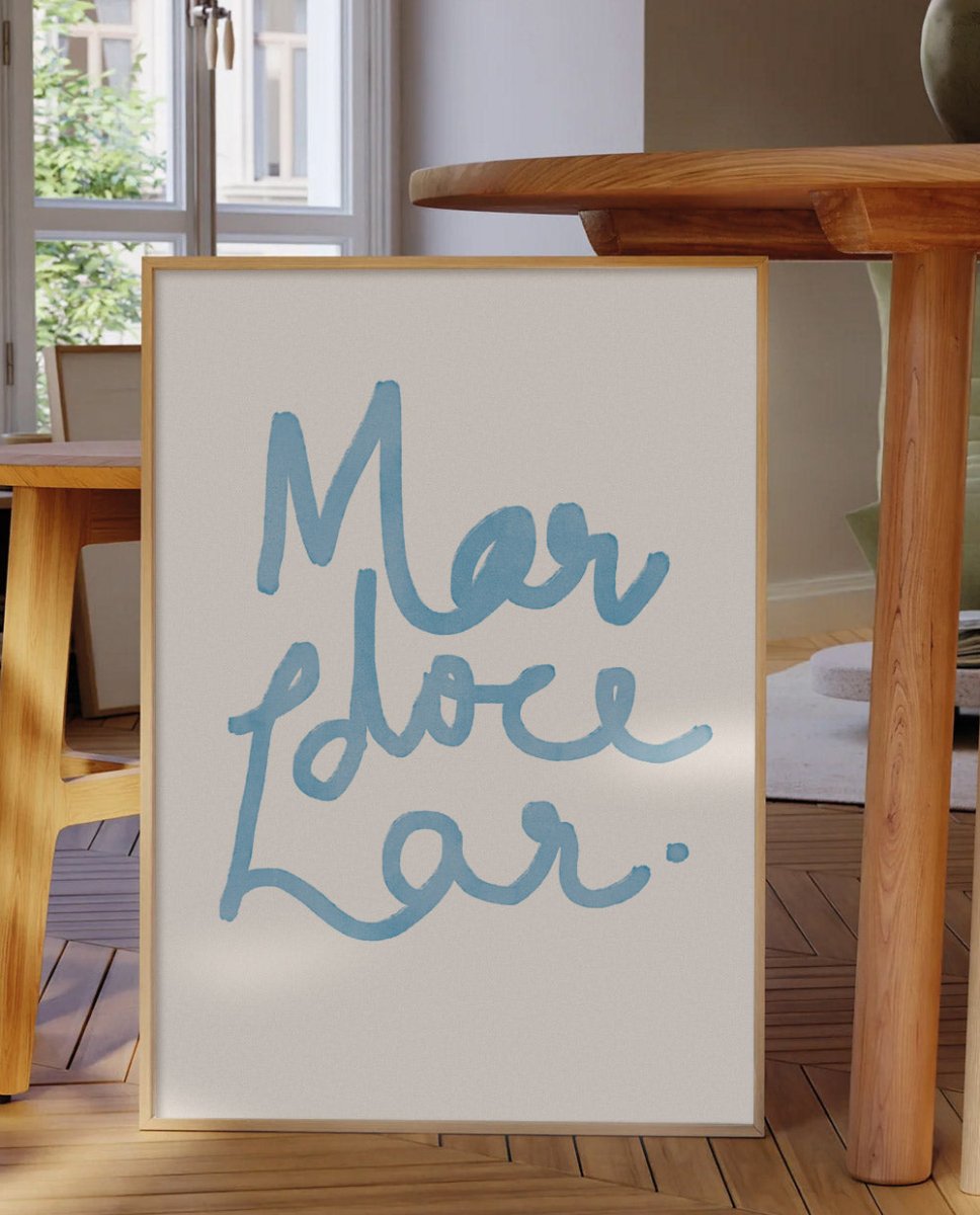 Leve o encanto do oceano para sua casa com o poster 'Mar Doce Lar' da Catita Illustrations. Com letras azuis em estilo aguarela sobre fundo branco, esta ilustração celebra a serenidade do mar. Disponível em vários tamanhos, em produto físico ou digital.